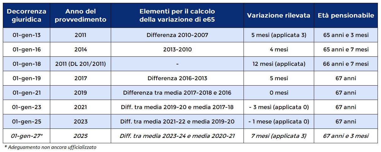 - 2021–2025: adeguamenti nulli per effetto del calo della speranza di vita durante e dopo la pandemia;